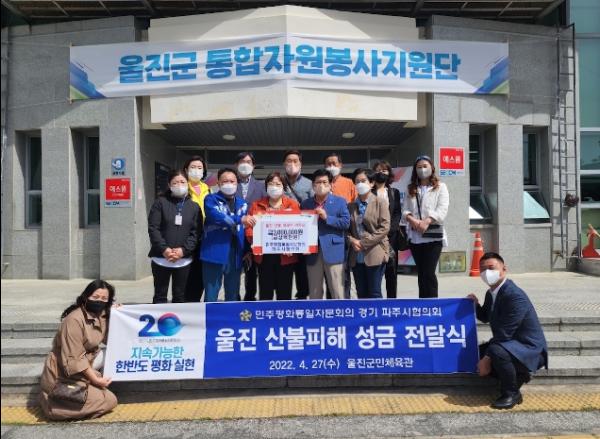 성금은 민주평통 파주시협의회 회장이 울진군에 위치한 경북사회복지공동모금회를 방문해 전달했으며, 기부자의 뜻에 따라 대형 산불로 피해를 입은 울진군 이재민 및 피해 복구를 위해 사용될 예정이다.