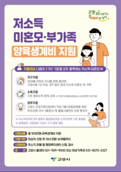 시는 지난해 '한부모가족 지원 조례'를 개정하고 만 36개월 이하의 자녀를 홀로 양육하며 생활의 어려움을 겪고 있는 저소득 미혼 한부모가족에게 월 100만원의 양육생계비를 지원하는‘고양시 저소득 미혼모?부가족 양육생계비 지원’사업을 추진하고 있다.