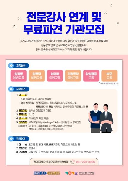 이와 별도로 도 및 31개 시?군, 공공기관, 학교, 일반 사업장 등을 대상으로 전문강사 연계 사업을 연중 진행한다. 경기도여성가족재단 교육포털에서 전문강사 찾기 후 강의 일정 및 강의료를 전문강사와 논의하면 된다.