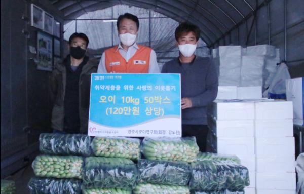 (사)양주시자원봉사센터(센터장 김용훈)는 지난 2일 양주시오이연구회(회장 강도진)에서 ‘오이데이’를 맞아 관내 어려운 이웃을 위해 오이(10kg) 50박스를 전달했다고 밝혔다.