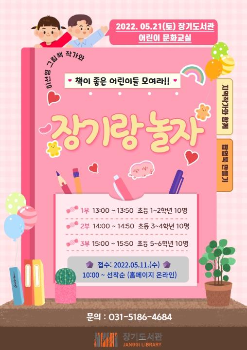 김포시 장기도서관은 오는 5월 21일(토) 지역작가와 함께하는 재능기부 어린이 프로그램 '장기랑 놀자!'를 운영한다.
