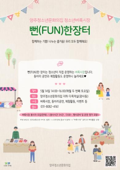 양주청소년문화의집은 오는 14일부터 관내 청소년과 가족단위 참가자가 직접 장터를 운영하는 청소년 벼룩시장 ‘뻔(FUN)한장터’를 운영한다고 밝혔다.