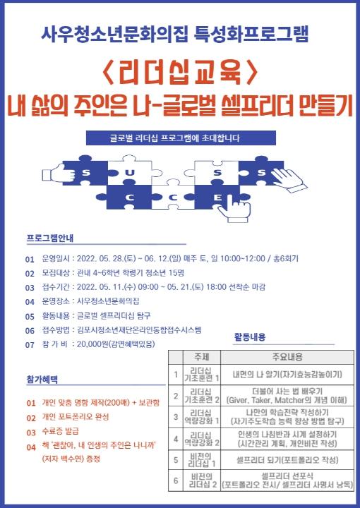 (재)김포시청소년재단 사우청소년문화의집에서는 글로벌 환경을 주도할 수 있는 셀프리더십을 갖춘 청소년 육성을 위해 인성과 학습능력을 두루 갖추어 자신의 삶을 스스로 개척해 나갈 수 있는 리더십 프로그램 ‘내 삶의 주인은 나 ? 글로벌 셀프리더 만들기’ 1기를 운영한다.
