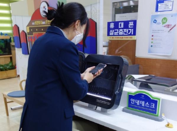 이번에 설치 된 휴대폰 살균충전기는 자외선 살균기능과 최대 4대까지 급속충전이 동시에 가능하여 민원처리를 위해 방문한 민원인들이 각종 업무처리를 위한 대기시간에 휴대폰 살균충전기를 간편하게 이용 할 수 있다.