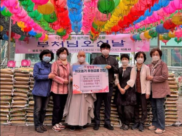 의정부시 장암동 소재의 석림사는 5월 2일 부처님 오신 날을 맞이하여 쌀 1천600kg을 장암동 주민센터 이웃돕기 창구에 기탁했다. 기탁된 쌀은 석림사 신도들이 장암동의 어려운 이웃들을 위해 십시일반 모은 것으로, 신도 한 명, 한 명의 따뜻한 마음이 담긴 것이다.