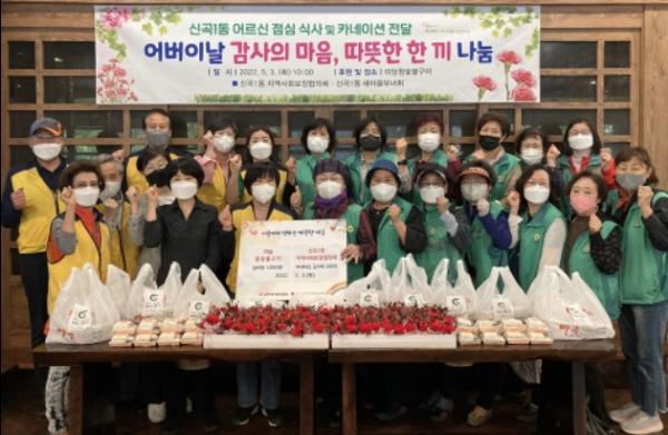 의정부시 신곡1동 지역사회보장협의체는 5월 가정의 달 어버이날을 맞아 관내 저소득 어르신 100명에게 따뜻한 한 끼 식사와 카네이션과 떡이 담긴 감사물품을 전달했다.