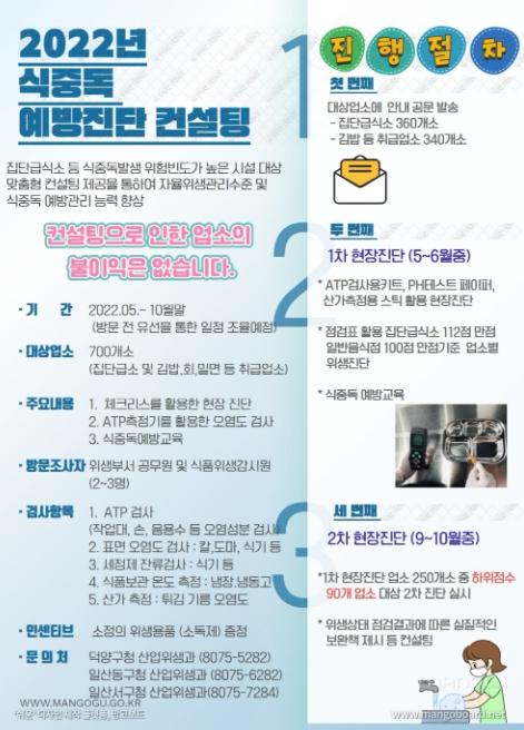 고양시 덕양구는 식중독 발생 제로화를 목표로 식중독 발생 위해요인을 제거하고 영업장 위생 상태를 개선하기 위해 5월부터 6월 말까지 약 두 달 간 ‘2022년 식중독 예방진단 컨설팅 사업’을 실시한다고 3일 밝혔다.