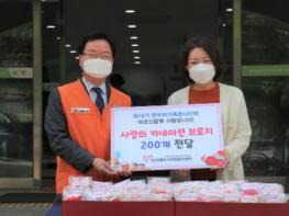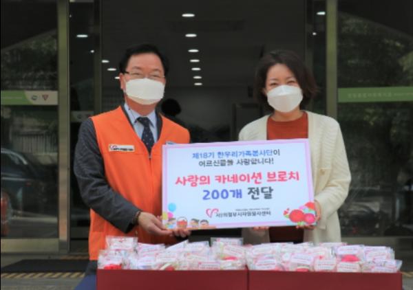 의정부시자원봉사센터(이사장 이용걸)는 지난 5월 2일 제18기 한우리가족봉사단이 직접 제작한 사랑의 카네이션 브로치 200개를 정승우 센터장이 장암종합사회복지관(관장 윤연희)을 직접 방문하여 전달하였다.