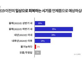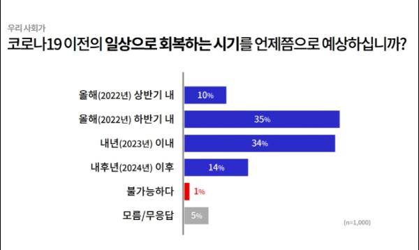 경기도가 지난 4월 18일 거리두기 해제 이후 4월 23일 도민 1천 명을 대상으로 여론조사를 실시한 결과, 도민들은 코로나19 이전 일상으로 회복하는 시기를 묻는 말에 ‘올해 상반기 내’ 10%와 ‘올해 하반기 내’ 35% 등 45%가 연내로 점쳤다. 이어 ‘내년 이내’ 34%, ‘내후년인 2024년 이후’ 14%, ‘불가능’ 1%로 조사됐다.