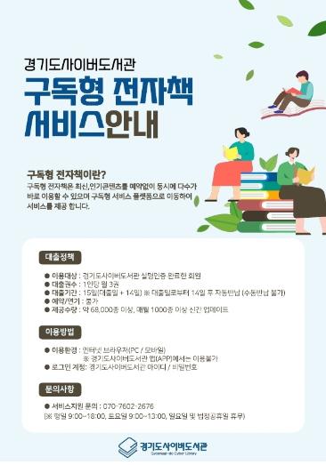 새로 도입하는 구독형 전자책은 6만8천여 종으로, 경기도사이버도서관은 매월 1천 종 이상 다양한 분야의 신규 전자책을 갱신할 예정이다. 또한 기존 소장형 전자책 1만7천298종과 이용자 희망 전자책, 교과지원 도서를 포함한 신규 소장형 전자책 517종, 국외 전자책 833종 등도 함께 제공될 예정이다.
