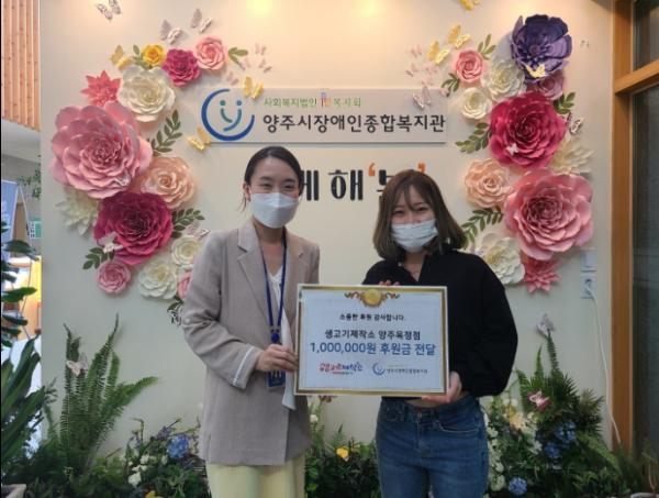 2022년 5월 3일 14시 ‘생고기제작소 양주옥정점’이 양주시장애인종합복지관에 후원금(금1,000,000원)을 기부하였다.