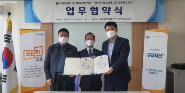 국가보훈처 경기북부보훈지청 제대군인지원센터는 4월 29일 ㈜양주교통과 대양운수㈜ 2개 기업과 제대군인 일자리 창출 노력을 통해 안정적인 사회정착을 지원하기 위한 업무협약을 체결하고 간담회 시간을 가졌다.