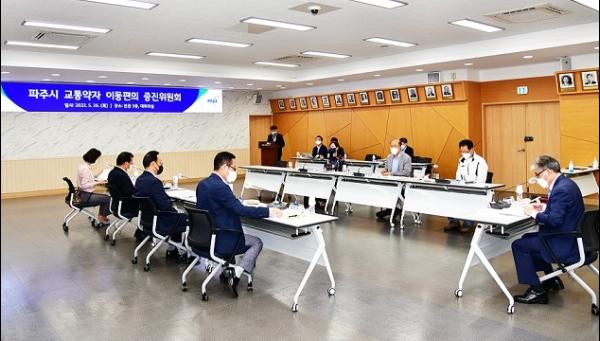 파주시는 26일 파주시청 대회의실에서 2022년 교통약자 이동지원서비스 개선안과 파주시 지방교통약자 이동편의 증진계획 용역안 심의 자문을 위해 고광춘 부시장 주재로 ‘교통약자 이동편의 증진위원회’를 개최했다고 밝혔다.