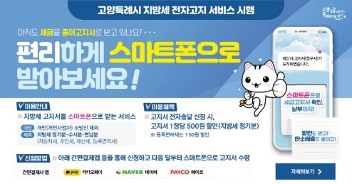고양시가 고지서를 받지 못 하거나 바쁜 일상 탓에 지방세 납부를 잊는 일을 예방하기 위해 지방세 전자송달 서비스를 시행하고 있다. 시는 세금 할인 혜택도 받을 수 있는 지방세 전자송달 서비스를 많은 시민이 이용하길 바란다고 전했다.