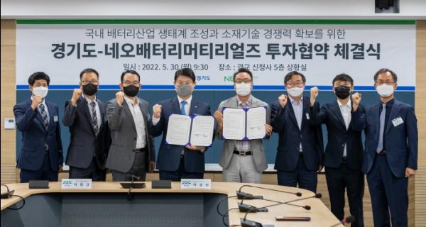 이한규 경기도 행정2부지사와 허성범 네오배터리머티리얼즈 대표(CEO)는 30일 경기도청에서 전기차 배터리 신소재의 양산을 조속히 지원하는 내용의 투자 양해각서를 체결했다.