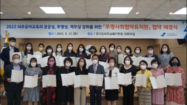경기도 파주교육지원청은 사립유치원의 자율적 책임 운영을 통한 공공성을 확보하고 유치원 현장과 소통하는 지원행정을 위해 31일 파주교육지원청 3층 대회의실에서 ‘2022 투명사회협약유치원’ 협약식을 실시했다.