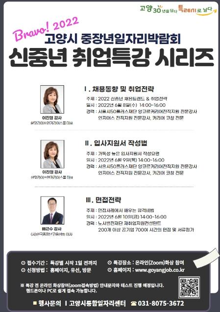 고양시가 신중년의 취업 준비를 지원하기 위해 온라인 취업특강을 오는 6월 8일(수)~10일(금) 까지 3일간 운영한다.