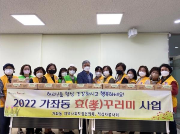 이번 행사는 가좌동 지역사회보장협의체가 주관하고 적십자봉사회가 참여하는 2022년 경로잔치 대안 사업으로 어르신을 공경하는 마음을 담아 효(孝)꾸러미를 제작했으며, 만 80세 이상 고령 어르신들은 위원이 직접 가정을 방문해 꾸러미를 전달하며 안부를 살필 예정이다.