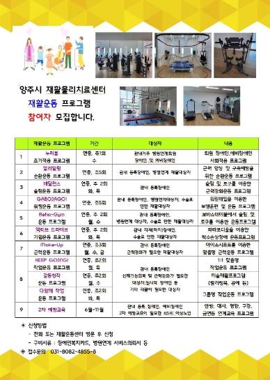 양주시는 지난달 은남통합보건지소에 개소한 재활물리치료센터에서 진행하는 전문 재활운동 프로그램 ‘지역사회중심재활사업’에 참여할 교육생을 모집한다.