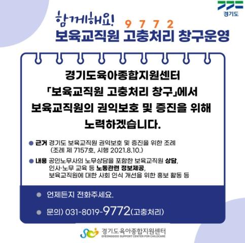경기도와 경기도육아종합지원센터가 보육교직원의 권익 보호·증진을 위해 올해부터 ‘보육교직원 고충처리 창구’를 운영 중이다.