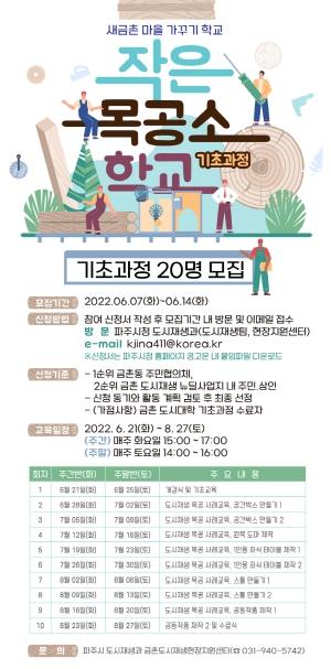파주시는 오는 14일까지 '2022 금촌 도시재생 작은 목공소 학교' 교육생 20명(주간반 10명, 주말반 10명)을 모집한다고 밝혔다.