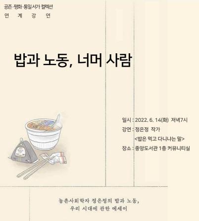 이번 강좌는 ‘3층 자료실의 ’공존·평화·통일‘ 서가의 ’공존‘ 연계 강연으로, 우리가 일상에서 먹고 사는 일의 구체성과 먹거리와 관련된 현장에서 일하는 사람들의 목소리를 전하며, 밥과 노동, 사람과 세상에 대해 생각해 보는 시간으로 진행된다.