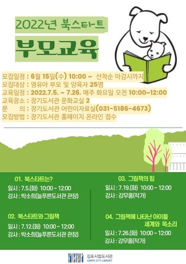 김포시 장기도서관은 오는 7월 5일부터 26일까지 4주간 매주 화요일 오전 10시부터 12시까지 영유아 자녀를 둔 부모 및 양육자를 대상으로 "2022년 김포시립도서관 북스타트 부모교육" 강좌를 운영하며, 교육 방법은 직접 대면 교육으로 진행될 예정이다.