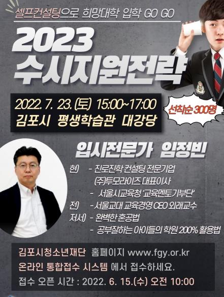이번 설명회 주제는 “수시지원전략 셀프 컨설팅”이다. 자신의 학생부 자료를 스스로 평가하고 그에 따라 지원하고자 하는 학과 및 대학에 맞추어 원서를 전략적으로 쓸 수 있는 주체적 진학 활동이 가능하게 되는 데에 목적이 있다. 학생부종합전형과 학생부교과전형 모두에서 탁월한 진학 정보를 제공하는 임정빈 강사(진로진학컨설팅 전문기업 (주)투모라이즈 대표, 완벽한 혼공법 저자)가 강의를 맡는다. 진로상담본부장(최규장)은 “김포시의 청소년들이 자신의 꿈을 위해 원하는 진학을 할 수 있도록 유능한 강사를 통해 최신 정보를 전달하도록 하겠다. 온라인 운영과 오프라인 운영 모두 꾸준히 참석하셔서 자녀들이 꿈을 이뤄나가는데 있어 기초를 다지시길 바란다.” 라고 전했다.