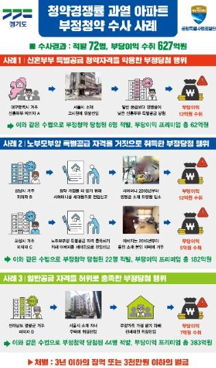 청약가점을 더 받기 위해 허위로 주민등록을 하거나, 요양원에 입소한 시어머니를 집에서 부양 중인 것처럼 위장하는 등 동탄2·광교신도시 일대 아파트 공급 자격을 허위로 충족해 당첨된 부정청약자 72명이 경기도 특사경에 대거 적발됐다. 웃돈(프리미엄)에 해당하는 부당이익은 총 627억 원에 달한다.