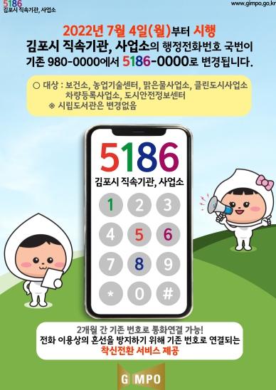 김포시는 행정기구의 지속적인 증가 등 인구 75만 대비 행정전화번호의 체계적 관리를 위하여 직속기관, 사업소의 행정전화 국번을 980에서 5186으로 7월 4일(월)부터 변경한다고 밝혔다.