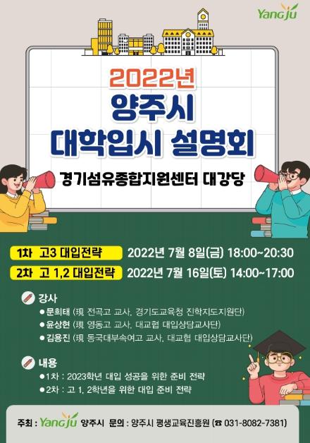양주시는 오는 7월 8일과 16일 두 차례에 걸쳐 대학진학을 앞둔 관내 고등학교 학생들의 진학설계를 지원하기 위해 ‘2022년 대학입시설명회’를 개최한다.