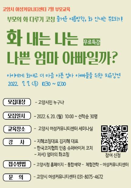 고양시 여성커뮤니티센터에서 여름방학을 맞이해 ‘즐거운 여름방학, 화 안내는 부모 되기 ’특강을 진행한다.
