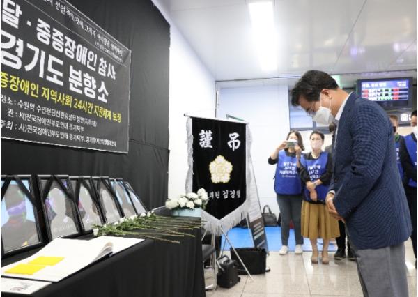 김동연 당선인은 15일 오후 수원역 지하 1층에 마련된 발달?중증장애인 참사 경기도 분향소를 찾아 헌화와 묵념을 한 뒤 발달장애인 가족들과 만났다.