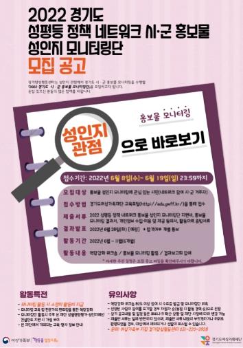 경기도여성가족재단 경기도양성평등센터가 시·군 홍보물의 성인지성을 점검하는 ‘경기도 성평등정책네트워크 시군 성인지 홍보물 모니터링단’을 오는 19일까지 모집한다.
