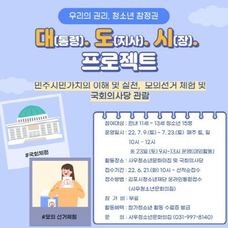(재)김포시청소년재단 사우청소년문화의집에서는 관내 청소년들에게 민주시민가치의 개념과 청소년 참정권 이해를 돕기 위한 우리의 권리, 청소년 참정권 ‘대(통령)? 도(지사)? 시(장) 프로젝트’ 1기를 운영한다.