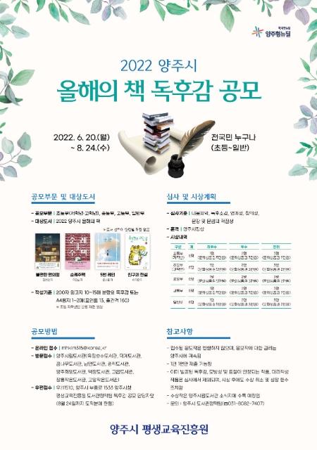 양주시는 오는 20일부터 8월 24일까지 2022년 양주시 올해의 책을 대상으로 독후감 공모전을 개최한다.
