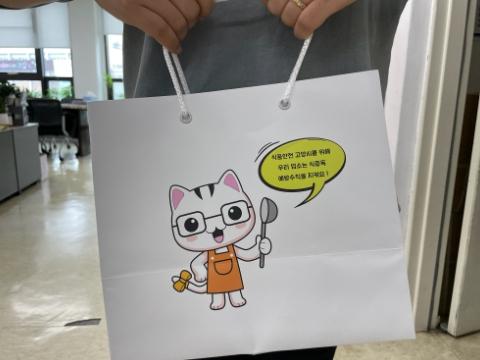 홍보물은 큐브박스 메모지 및 쇼핑백이다. 메모지에는 식중독 예방 수칙과 응급처치 요령이 표기되어있고 쇼핑백에는 식중독 예방수칙과 ‘우리 업소는 식중독 예방수칙을 지켜요’라는 문구가 인쇄되어 있다.