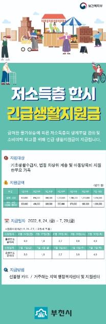 부천시는 급격한 물가상승에 따른 저소득층 생계부담 완화 및 소비여력 제고를 위하여“저소득층 한시 긴급생활지원금”을 지급한다.