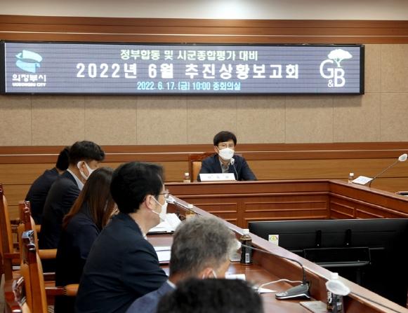 의정부시는 6월 17일 시청 중회의실에서 정부합동 및 시·군종합평가 지표 담당 부서장 23명이 참석한 가운데 안동광 의정부시 부시장 주재로 ‘2022년 정부합동 및 시·군종합평가’ 대비 추진상황보고회를 개최했다.
