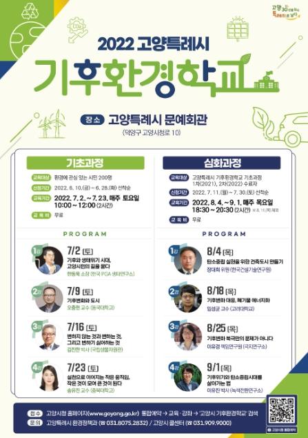 기후환경학교는 기초 과정과 심화 과정으로 운영되며 고양시 문예회관(덕양구 고양시청로 10)에서 대면교육으로 진행된다. 기초과정은 7월 2일부터 7월 23일까지 매주 토요일마다, 심화과정은 8월 4일 부터 9월 1일까지(8. 11. 제외) 매주 목요일마다 진행될 예정이다.