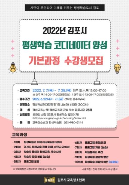 김포시는 2022년 평생학습 코디네이터 양성 기본과정 수강생을 오는 6월 22일부터 7월 1일까지 모집한다.