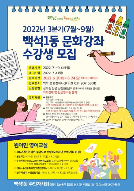 고양시 일산동구 백석1동 주민자치회는 7월 문화강좌가 재개됨에 따라 6월 20일부터 6월 24일까지 3분기(7월~9월) 수강희망자를 모집한다고 밝혔다.