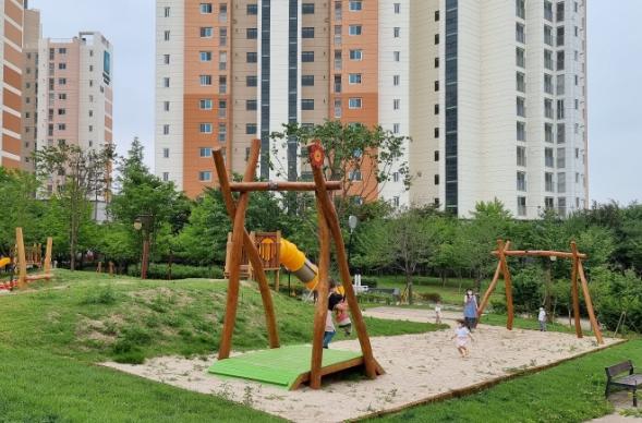 이와 함께 시는 놀이터 내 조경수목과 다양한 초화류를 식재하고 바닥이 올록볼록한 마운딩 언덕을 설치해 이용 아동들의 정서 함양과 안전성 향상에 신경을 썼다.