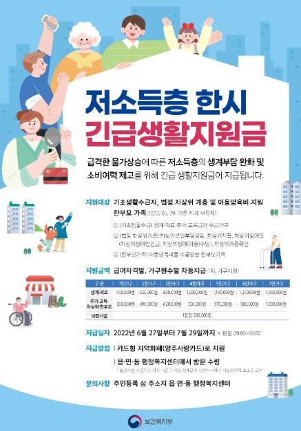 양주시는 오는 27일부터 7월 29일까지 급격한 물가상승에 따른 저소득층의 생계부담을 완화하고 소비여력 제고를 위해‘한시 생활지원금’을 지원한다고 밝혔다.