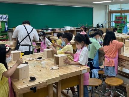 2022학년도 경기도교육청-기초지자체 학교프로그램 협력사업으로 초등목공교실 운영교로 선정된 덕정초에서 학생들에게 목공중심 메이커 교육을 실시하고 있다.