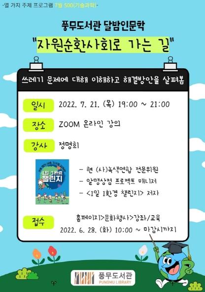 김포시 풍무도서관은 달밤인문학 '자원순환사회로 가는 길' 강연을 2022년 7월 21일 목요일 오후 7시에 줌(ZOOM)을 활용하여 비대면으로 운영한다.