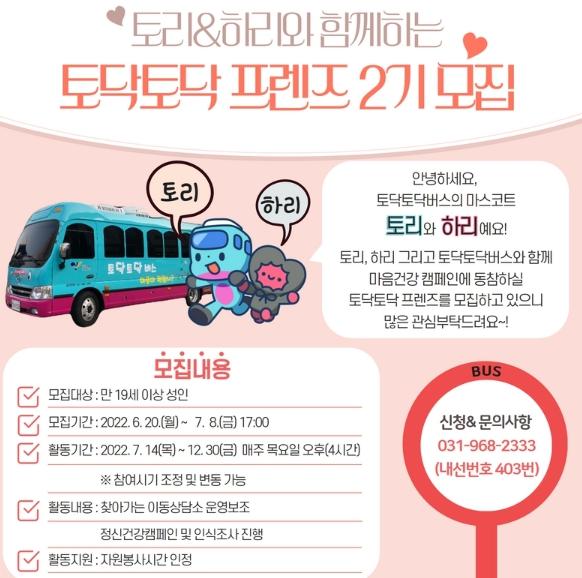 고양시정신건강복지센터는 6월 20일부터 7월 8일까지 찾아가는 이동상담소 토닥토닥 버스 운영을 위한 토닥토닥 프렌즈를 모집한다고 밝혔다.
