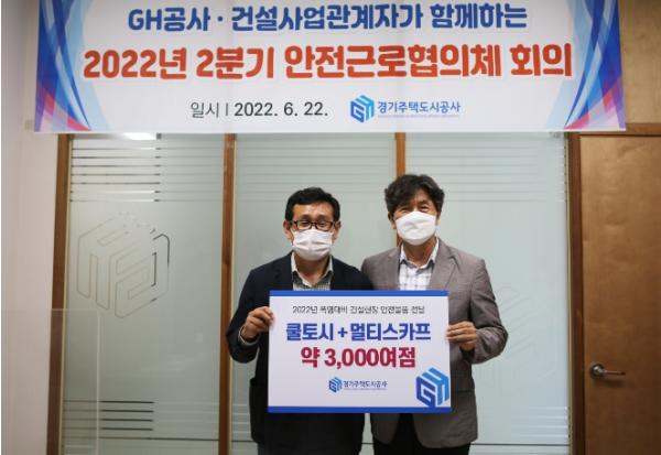 전형수 GH부사장(사장직무대행)은 안전근로협의체 회의를 직접 주관하며 ‘중대재해 ZERO, 일반재해 50%감축’ 안전보건경영방침을 강조하면서, 혹서기 대비 건설근로자 건강관리를 위한 쿨토시, 멀티스카프 등 폭염대응물품을 전달했다.