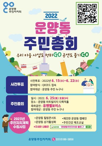 김포시 운양동 주민자치회가 주관하는 ‘2022년 운양동 주민총회’가 25일 오후 3시 김포아트빌리지 아트센터 다목적홀1층에서 개최된다.