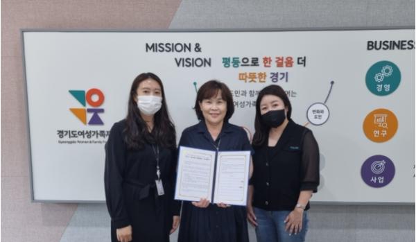 경기도여성가족재단 정정옥 대표이사는 23일 재단 회의실에서 캠페인 주관 기관인 경기도자원봉사센터 관계자와 함께 ‘경기도 탄탄대로 공동캠페인’ 업무협약서에 서명했다.